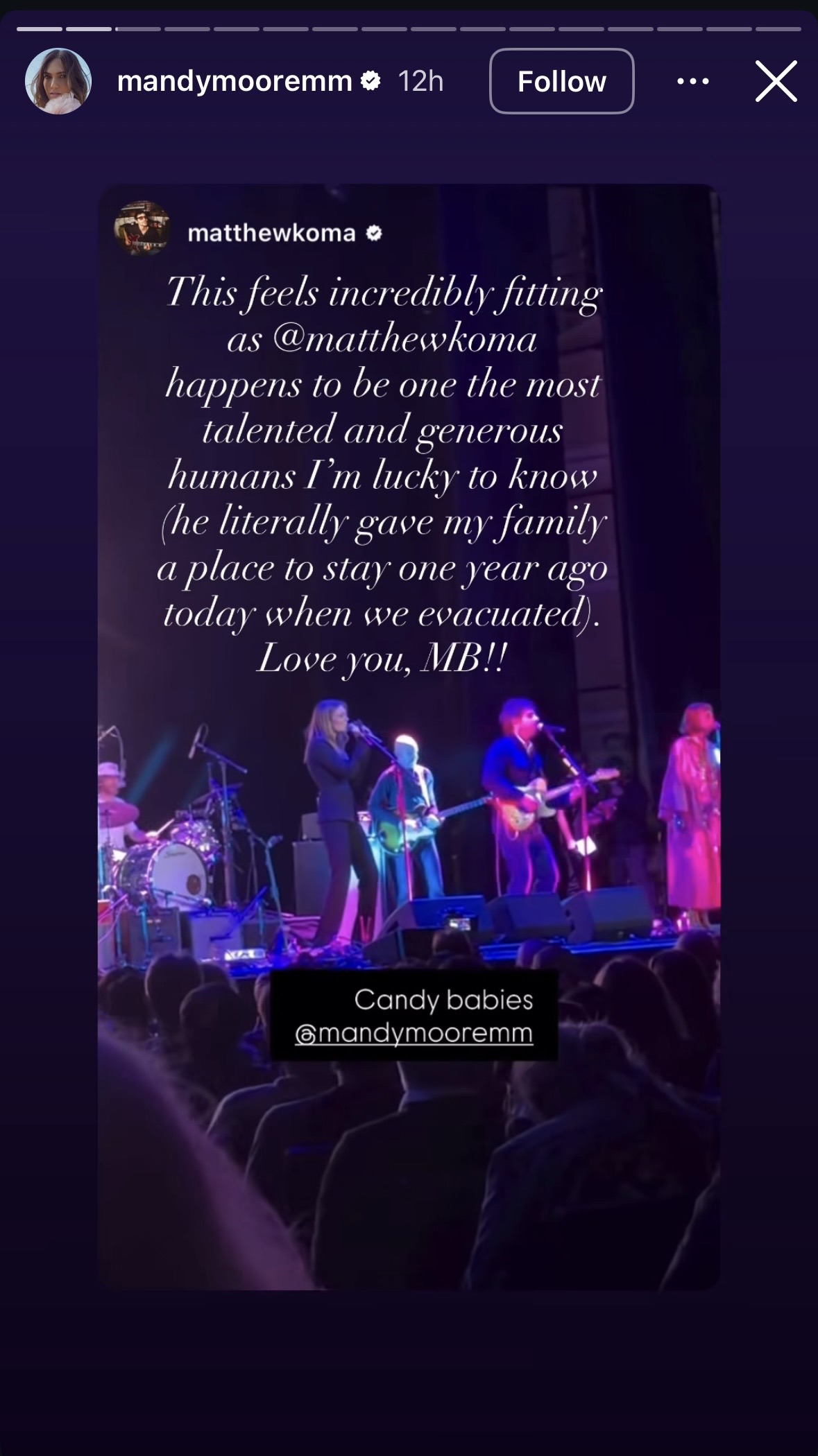 "This feels incredibly fitting as @matthewkoma happens to be one of the most talented and generous humans I'm lucky to know (he literally gave my family a place to stay one year ago today when we evacuated)," she wrote.