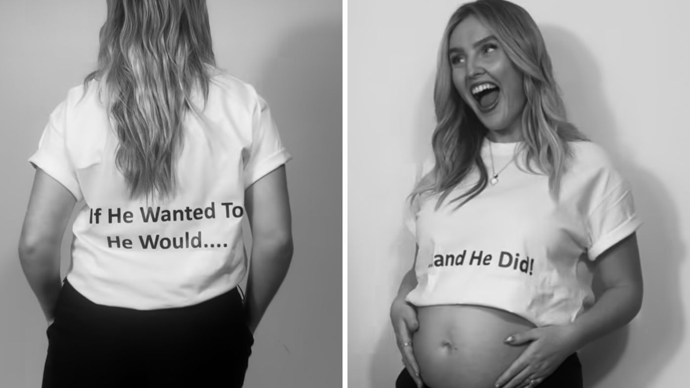 She then turned around to reveal her pregnant stomach and the words "...And he did!" on the front of the T-shirt, before Oxlade-Chamberlain appeared on camera to embrace his partner.