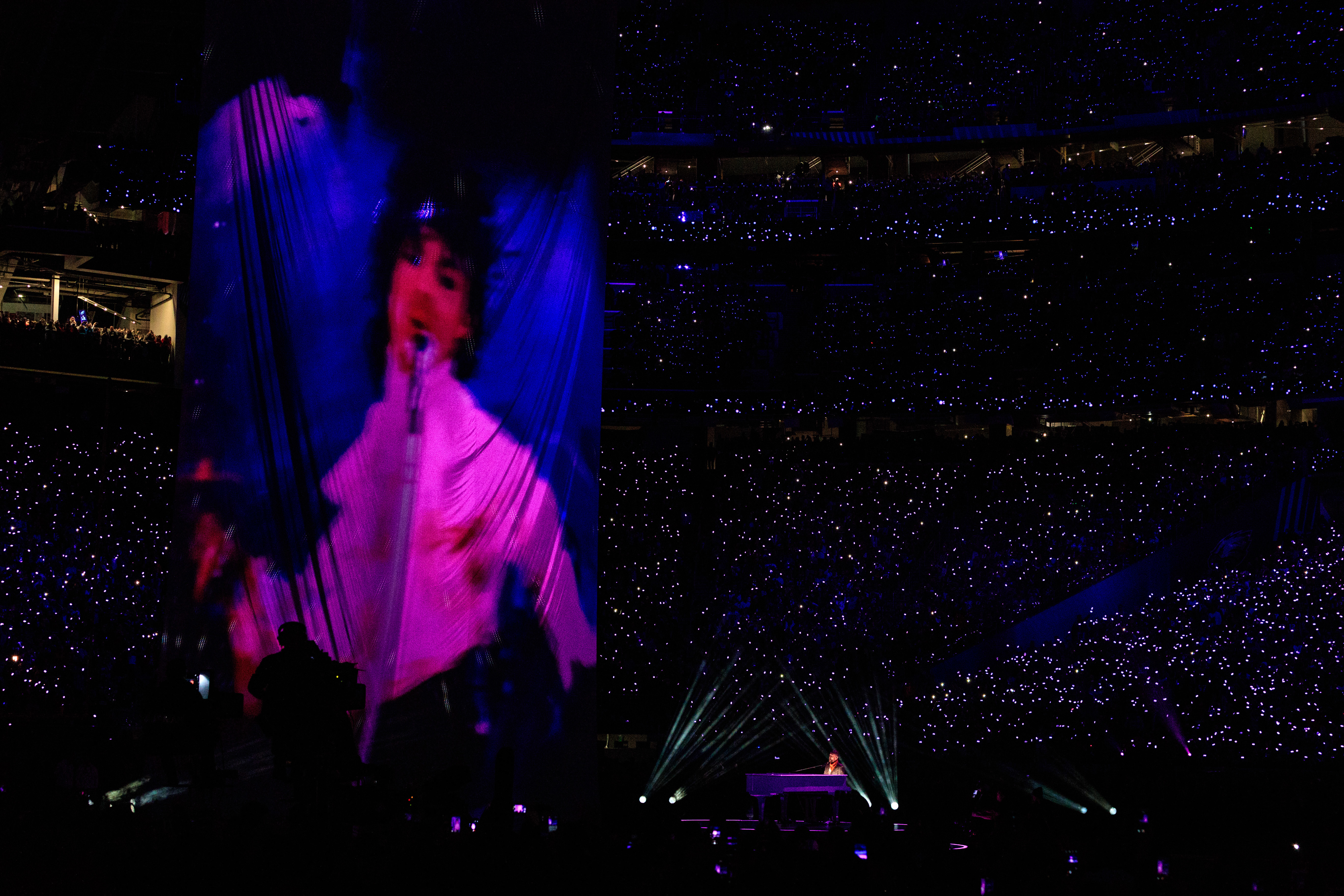 In the middle of his final song Purple Rain, he launched into a guitar solo as a beige sheet dropped in front of him, creating a rather interesting silhouette.